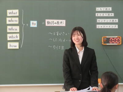 17日(月)4校時、8年生で教育実習生の可藤先生による、英語の授業がありました。「疑問詞+to+動詞の原形」の学習のまとめとして、スライドを使って、文章の並びかえや「誰でしょう?」クイズをしてくださいました。8年生の皆さんも、班で協力して考え、たくさん正解していましたね。多くの先生が見に来られている中でしたが、楽しい雰囲気で授業が行われました。可藤先生と過ごした時間と、教えていただいた学習内容をしっかり心に留めておきましょう。可藤先生、ありがとうございました。